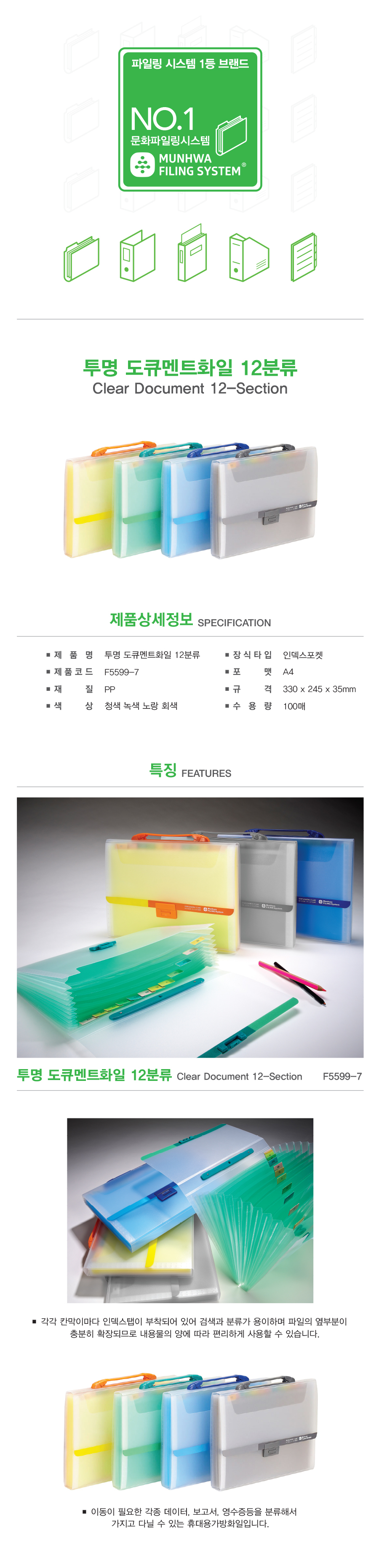 ■ 품명 및 모델명 : 투명 다큐먼트화일 12분류(청색/F5599-7/문화산업)